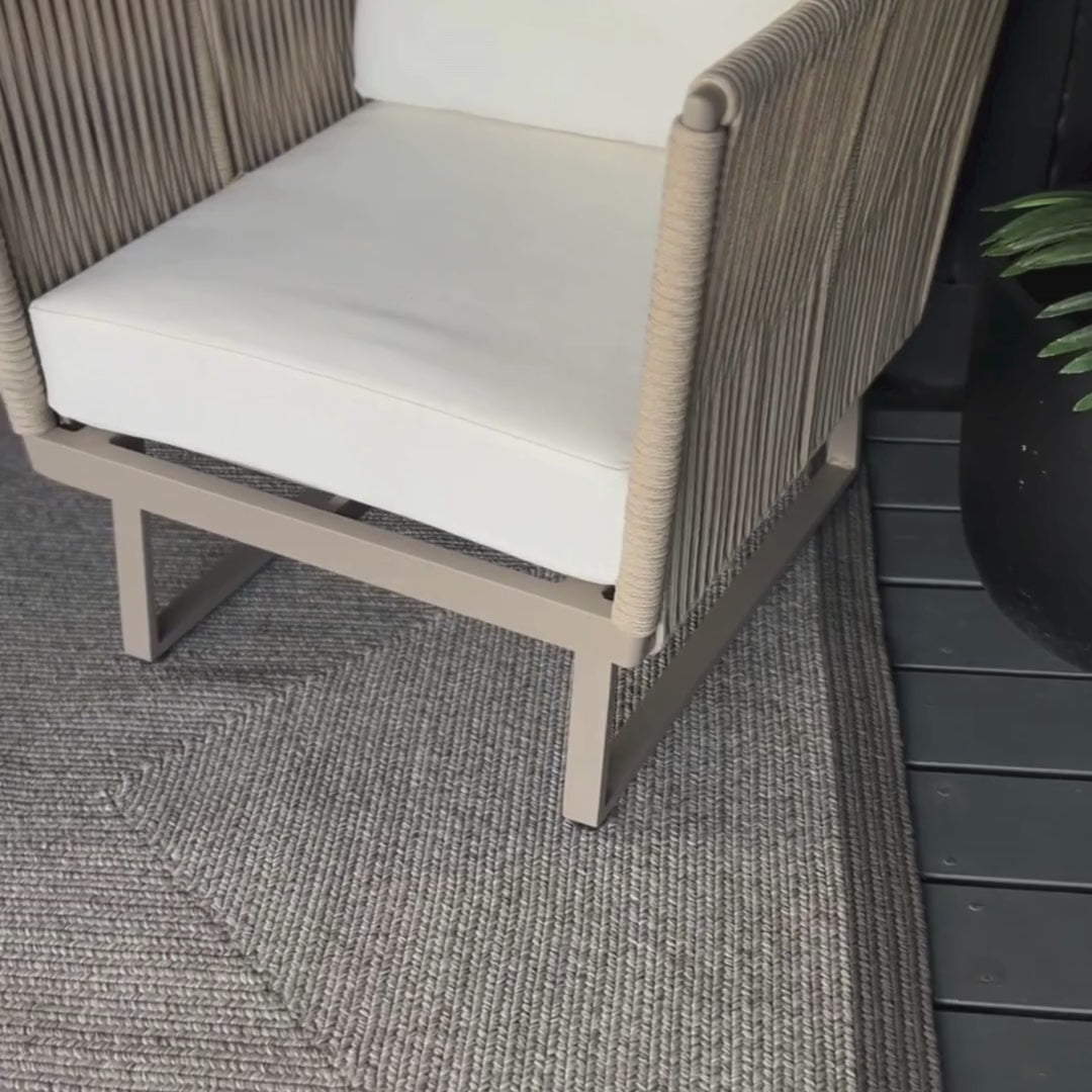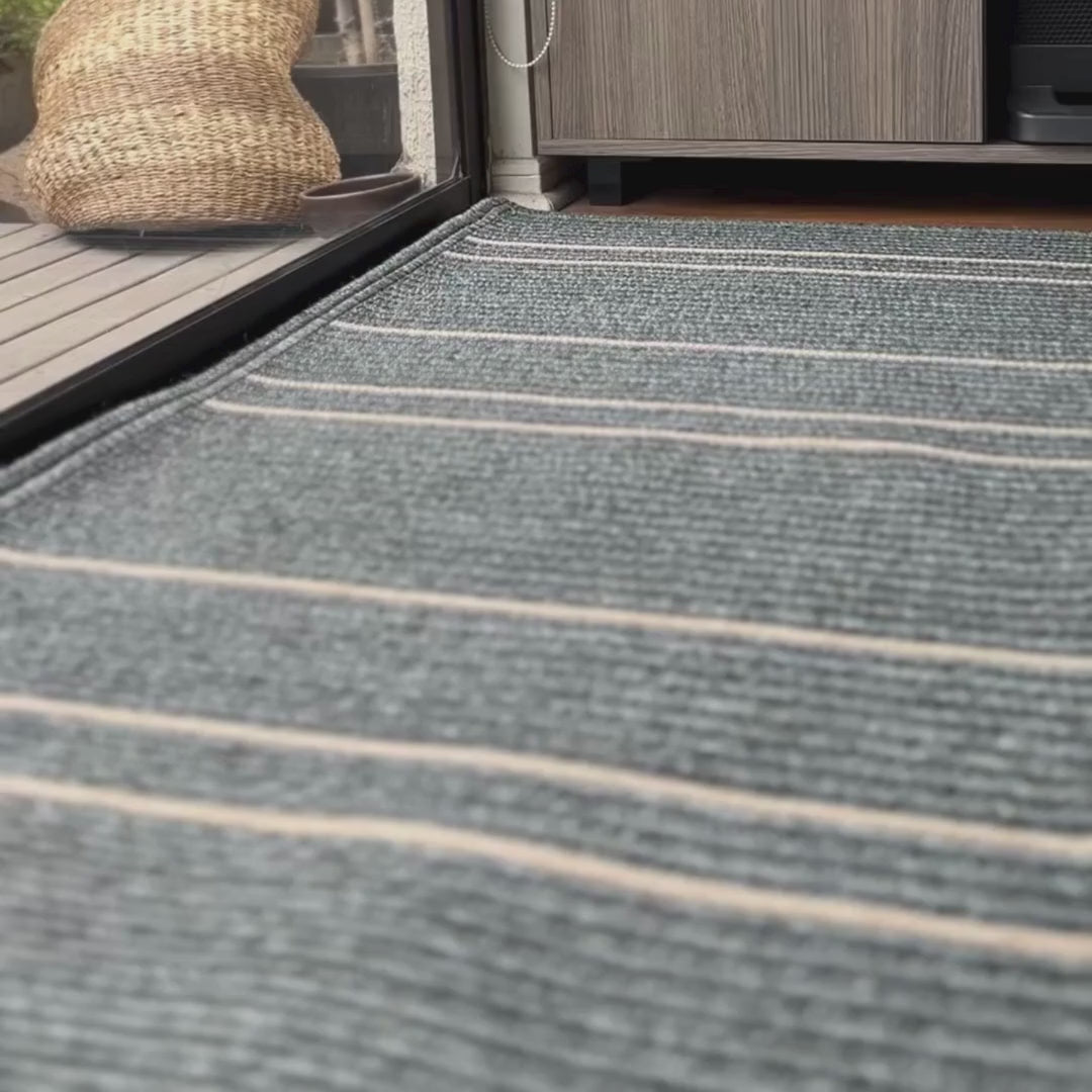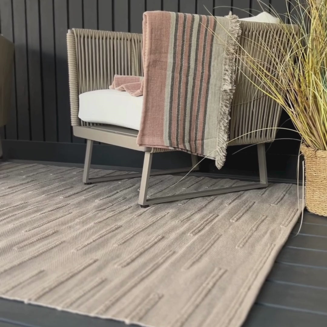 Alfombra artesanal de polipropileno, duradera y de fácil mantenimiento, apta para interiores y exteriores.